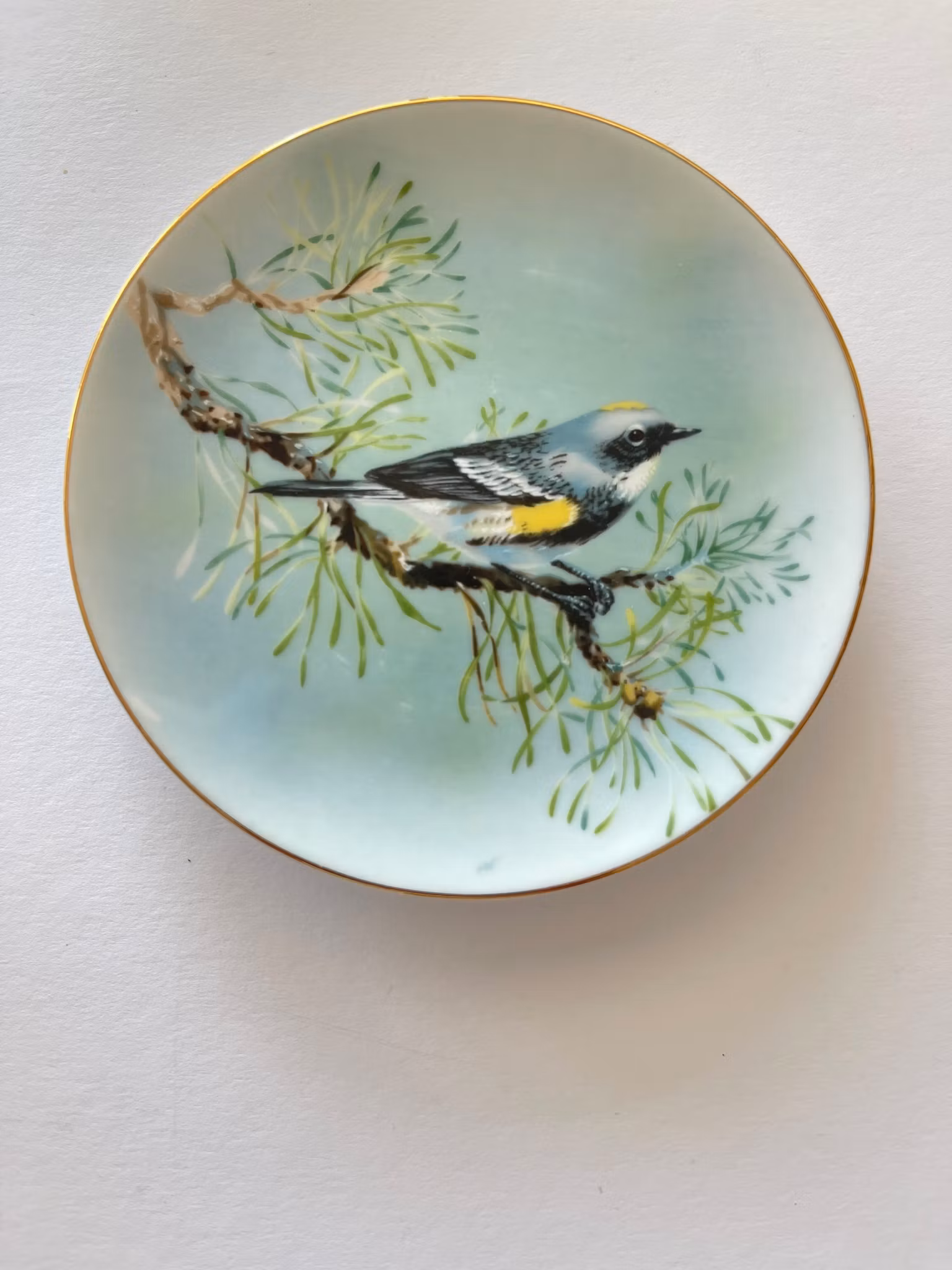 Toppfatet er delikat og elegant med fuglemotiv og gullkant, som gir helheten et lett og sofistikert uttrykk