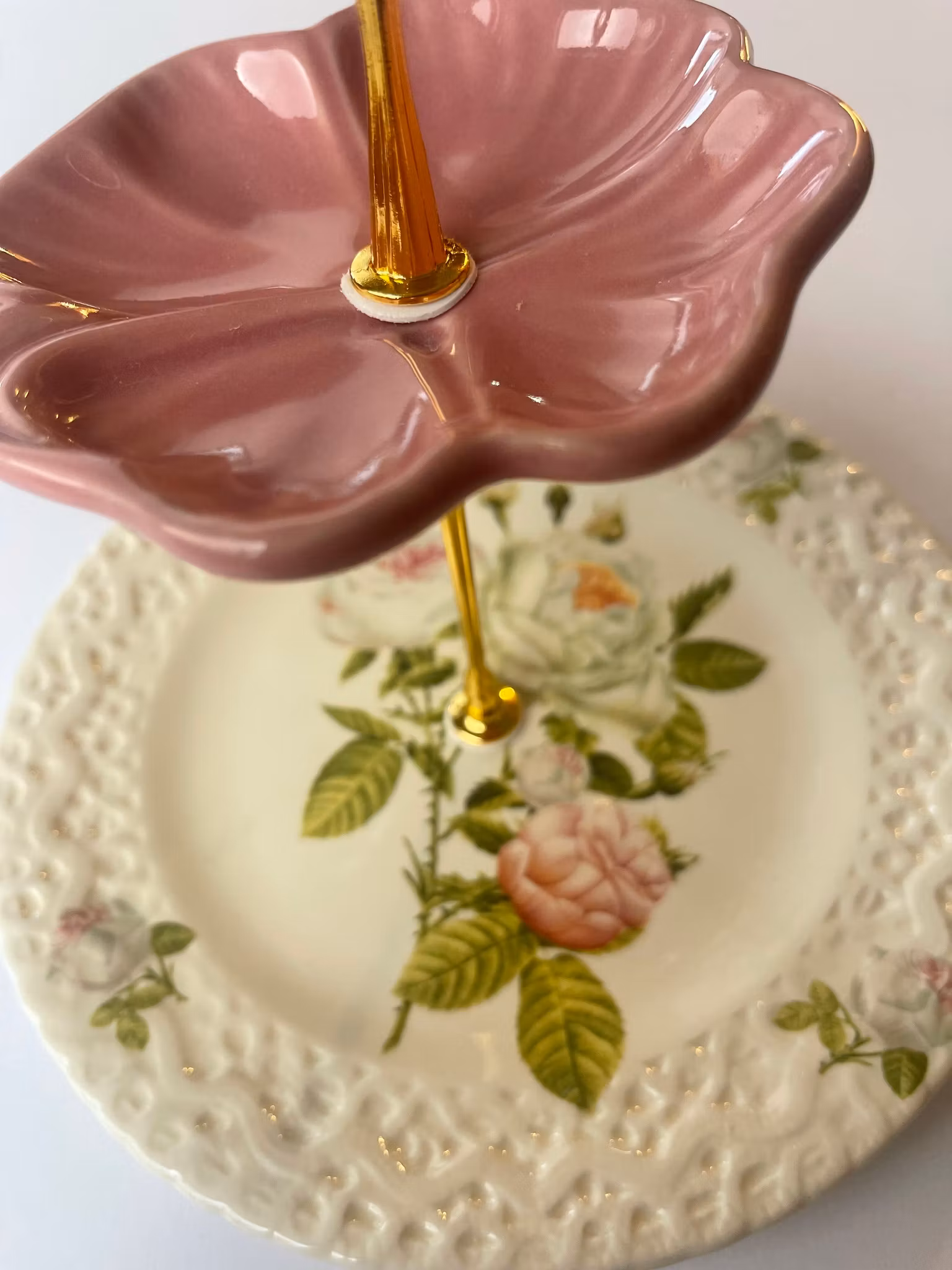 petite etasjefat, lite etasjefat, rosemønster, Miljøgården, blomsterskål, rosa fat, romantisk interiør, vintage stil, serveringsfat, smykkefat, gaveidé, unikt fat, Snålnåla petite collection