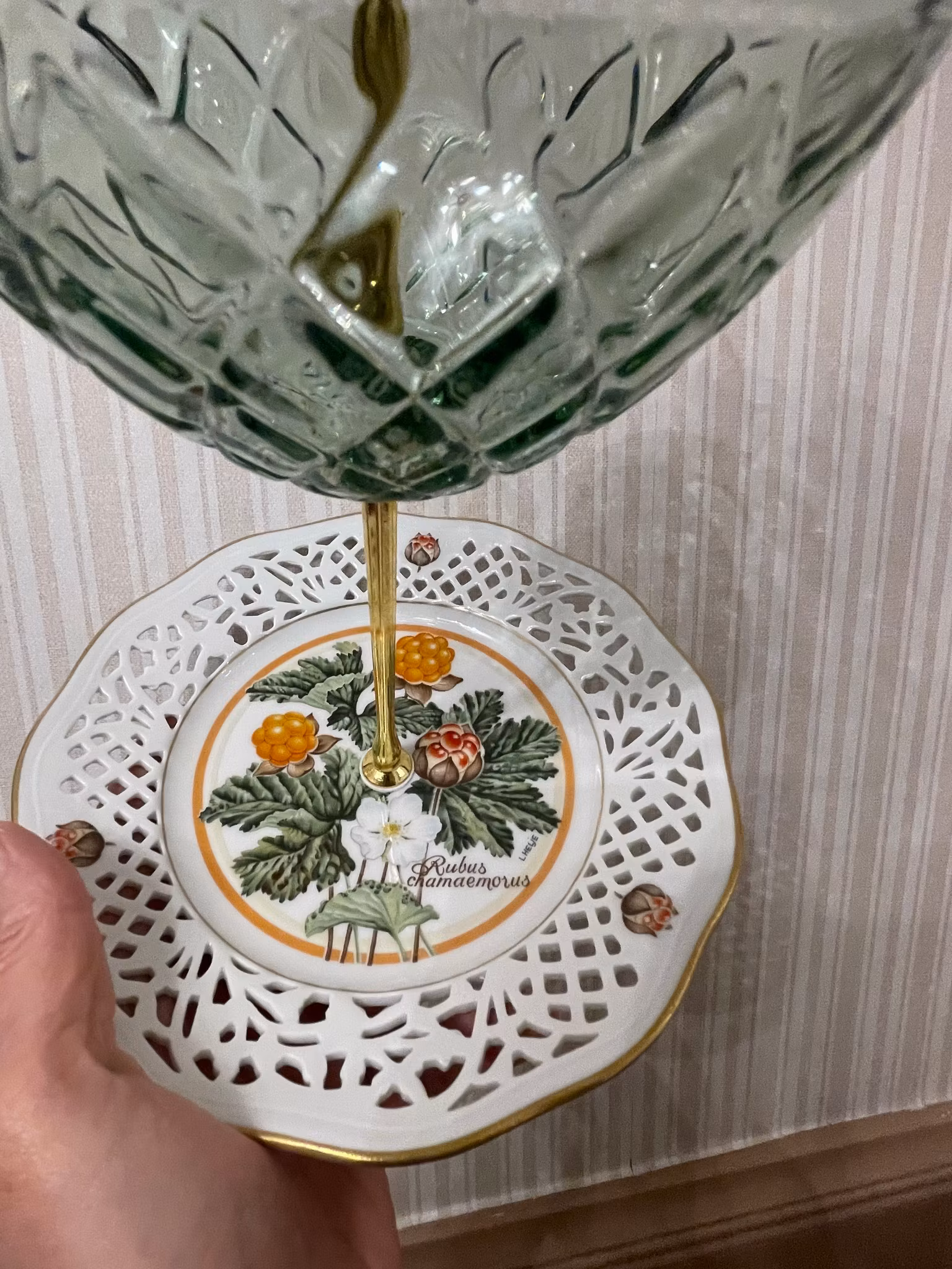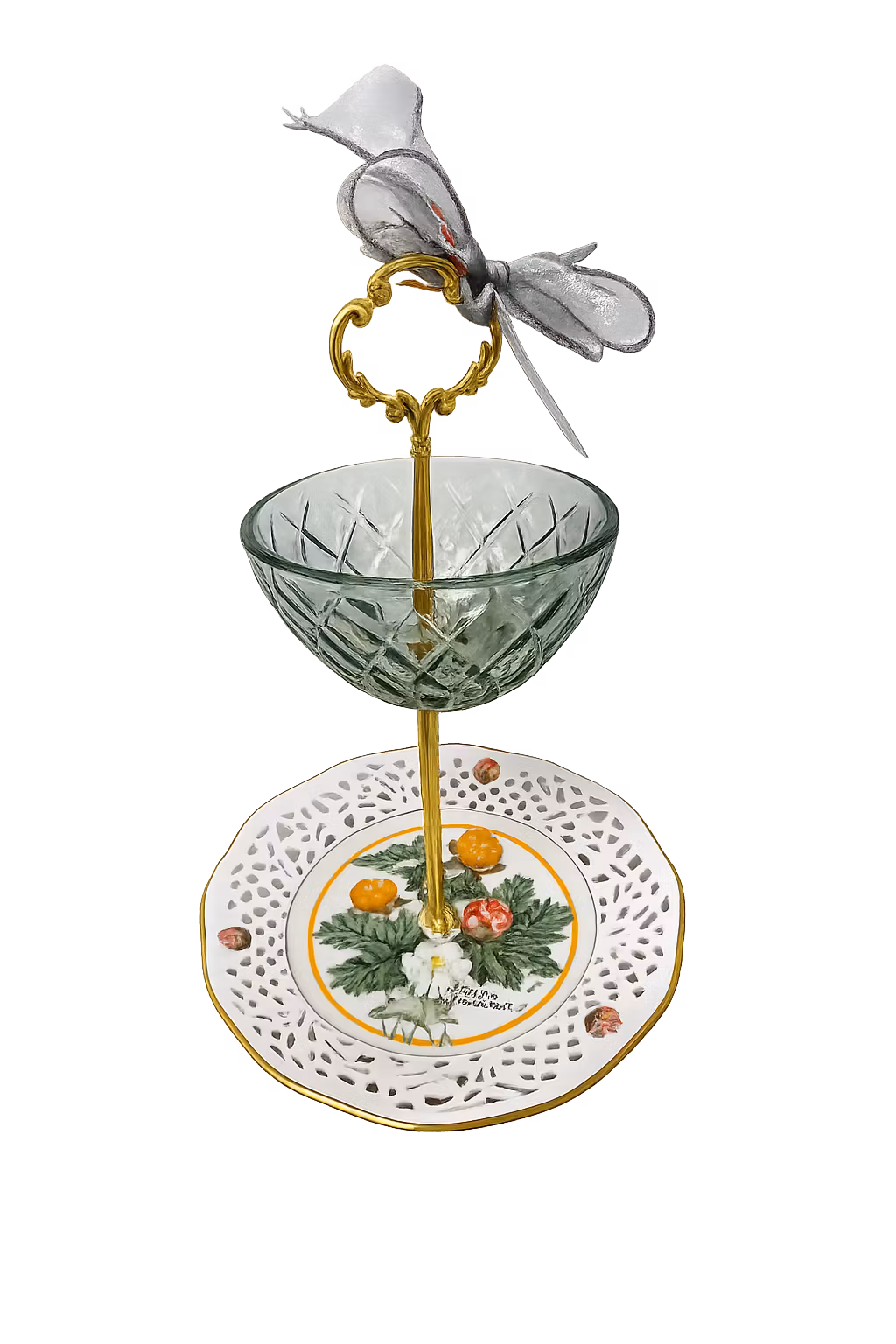 Stemningsfullt etasjefat satt sammen som ombruksdesign. Nederste fat er et vintage porselensfat fra serien Nordiske bær, med dekor av multe (Rubus chamaemorus) og gjennombrutt hullmønster. Gullforgylt kant gir et elegant preg.