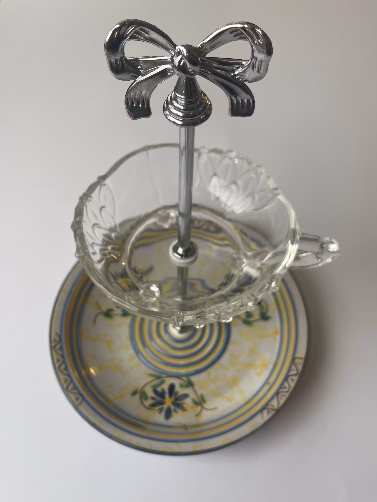 Petite etasjefat i en sjarmerende kombinasjon av håndmalt keramikk og glass.