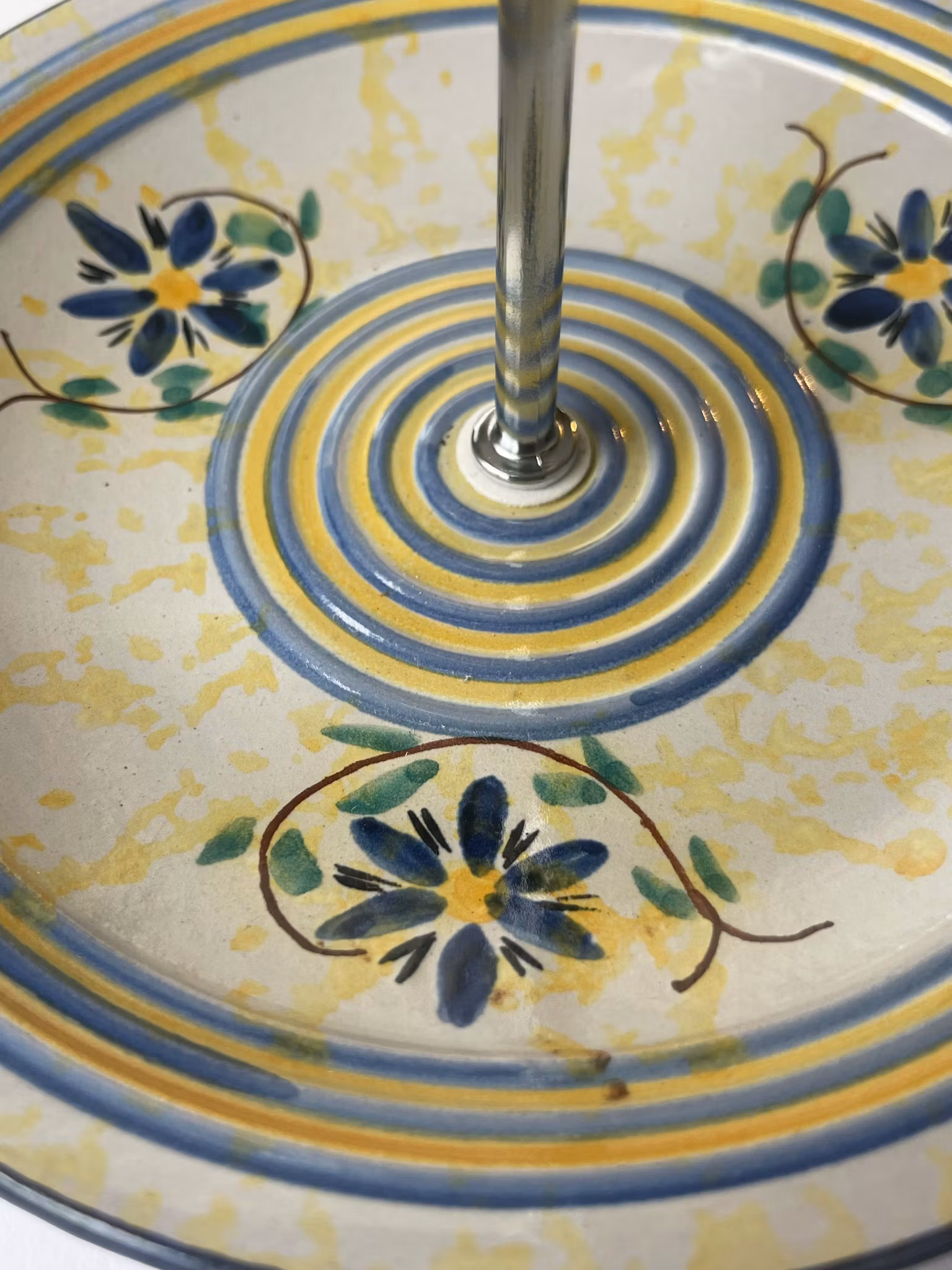 Bunnfatet er i håndmalt og signert keramikk med dekor i blått og gult, og har et levende, kunstnerisk uttrykk. Toppen er en elegant glasskål med hank og dekorativ struktur – perfekt til små serveringer eller som oppbevaring.