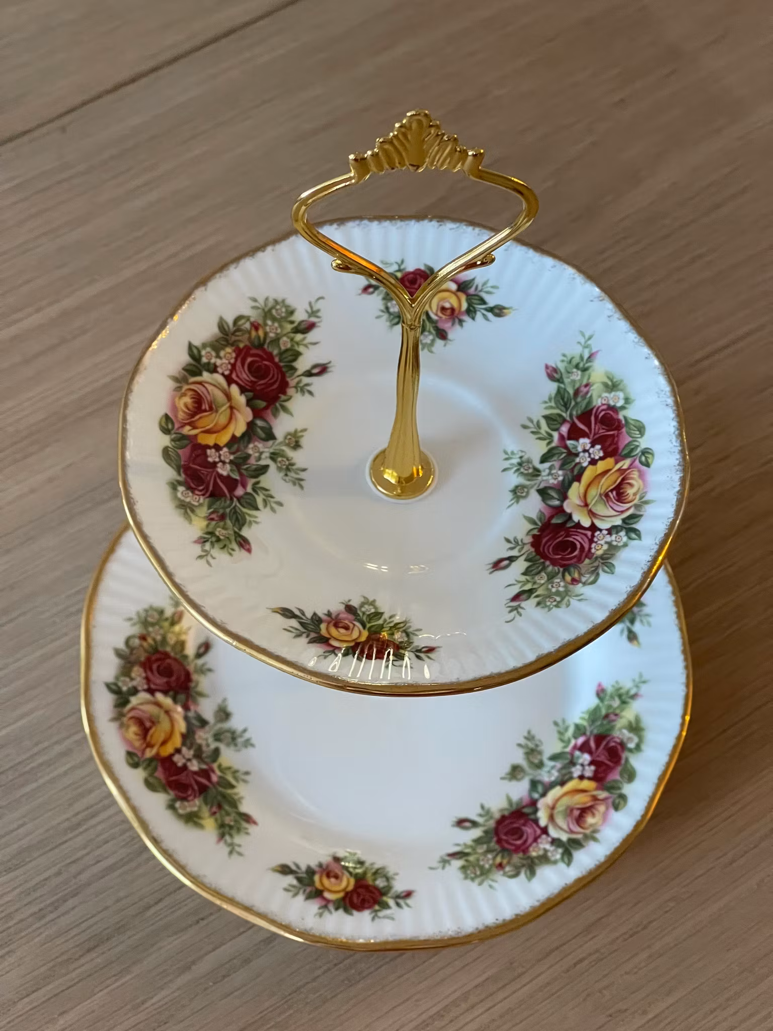 To delikate etasjer dekorert med romantiske roser i dype røde, varme gule og myke grønntoner – som en liten engelsk hage i miniatyr.