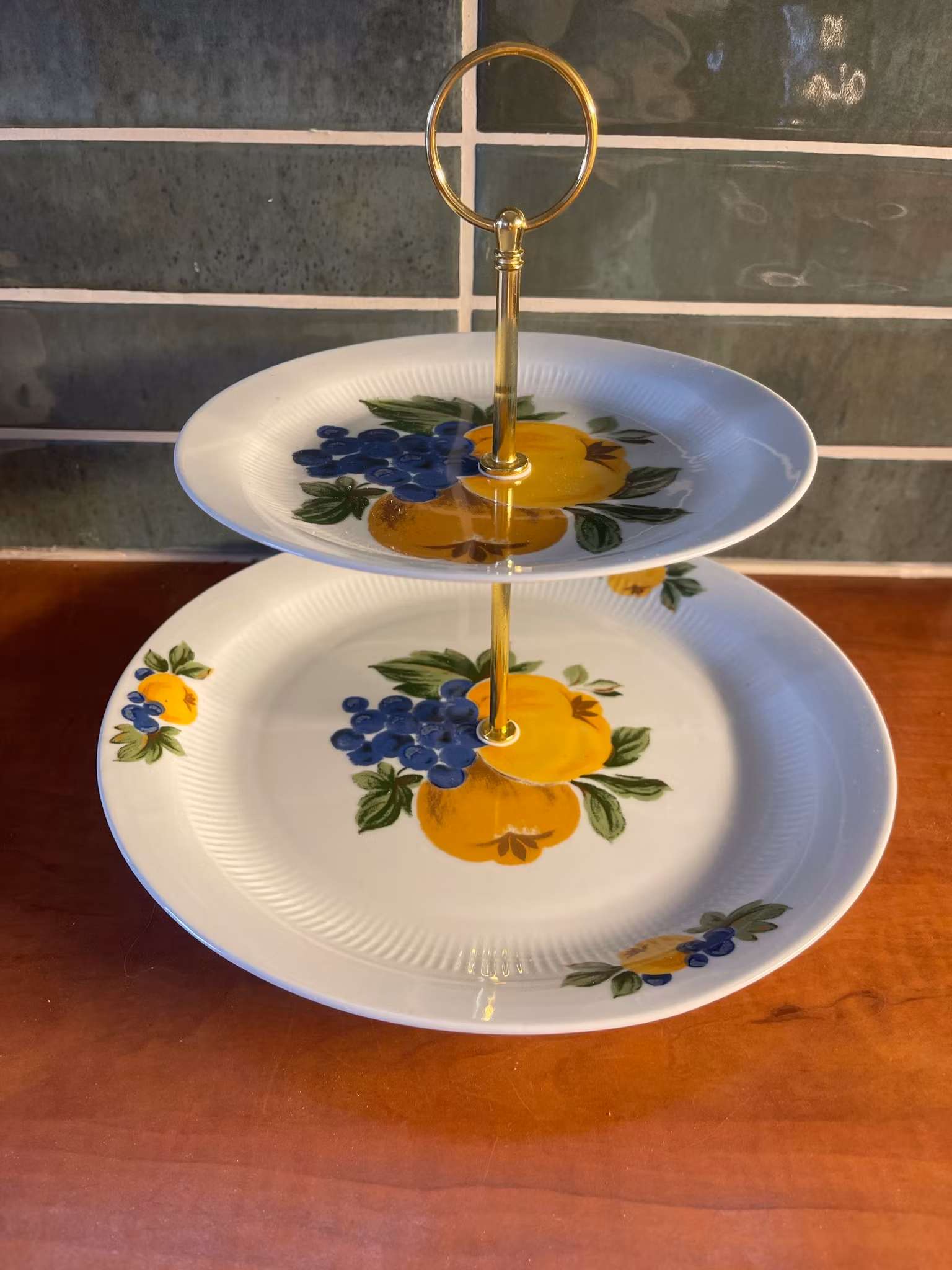 Solid og dekorativt etasjefat satt sammen av vintage porselen fra tidligere Øst-Tyskland (GDR). Begge fat er produsert av Inglasur og merket Made in GDR.Fatene har et klassisk fruktmotiv i varme gulfarger med blå detaljer, og gir et tydelig retro-/midcentury-preg. Gullfarget stativ gir et elegant løft.