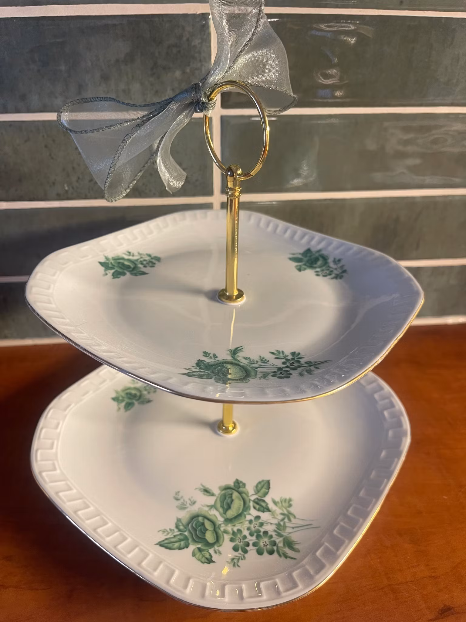 Elegant vintage etasjefat satt sammen av porselen fra Wawel. Fatene har et klassisk, grønt blomsterdekor som gir et rolig og tidløst uttrykk.