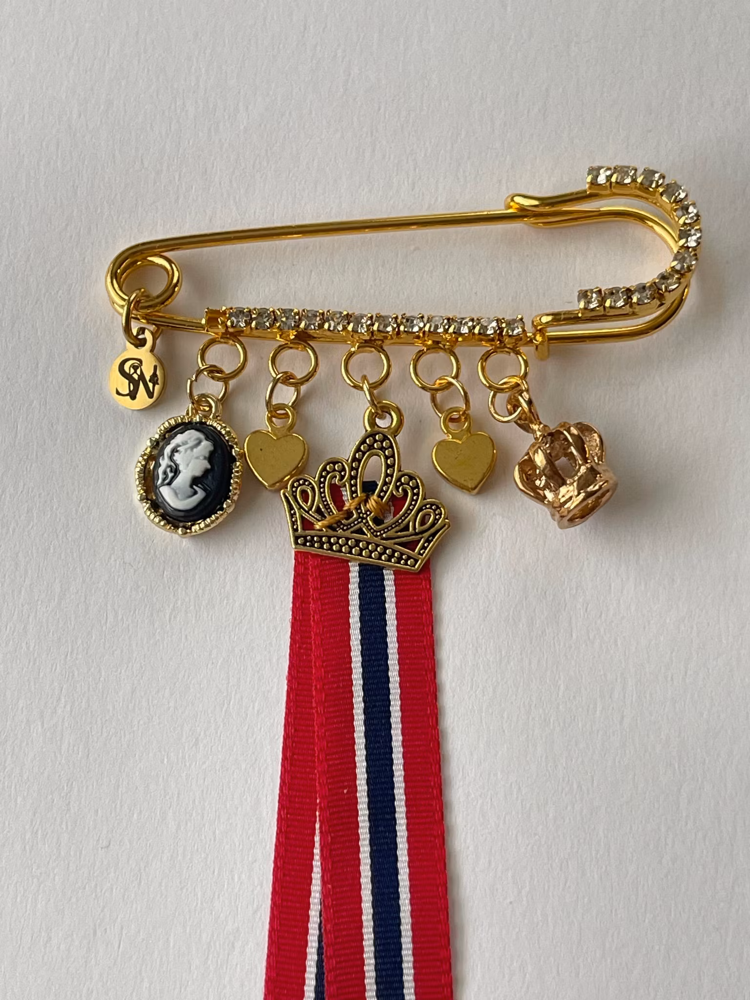 🇳🇴Gullforgylte 17.mai-nåler med krystaller og anheng. Sløyfene er av beste kvalitet, og sydd på filigransanheng for hånd 🧵 🪡👌🏻