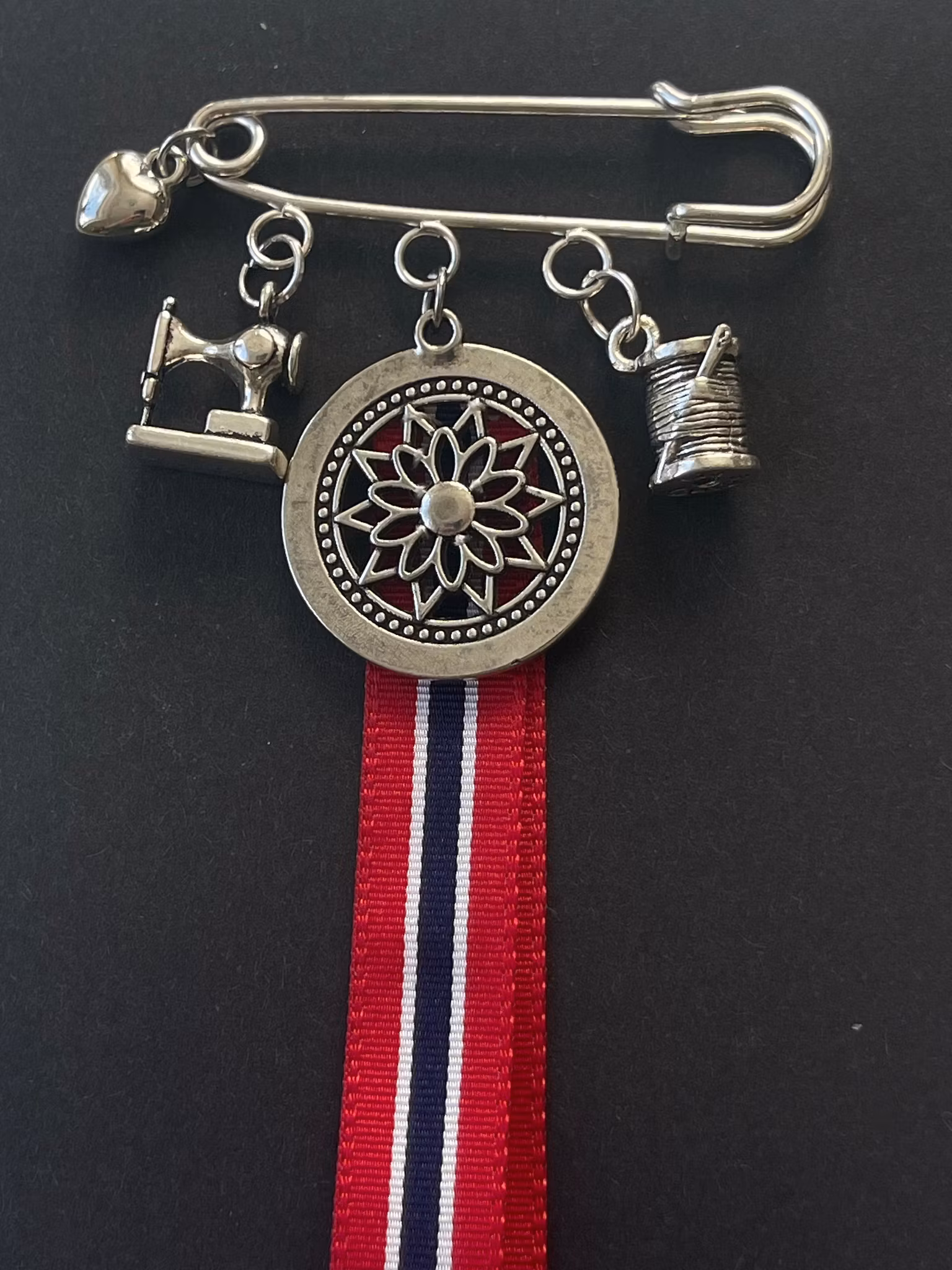 Denne 17. mai-nåla er laget for deg som syr, broderer og skaper – enten det er bunader, festdrakter eller små og store prosjekter i hverdagen. Med detaljer som symaskin, nål og tråd, og en dekorativ amulett hvor sløyfen er festet, får nåla et ekstra personlig uttrykk.