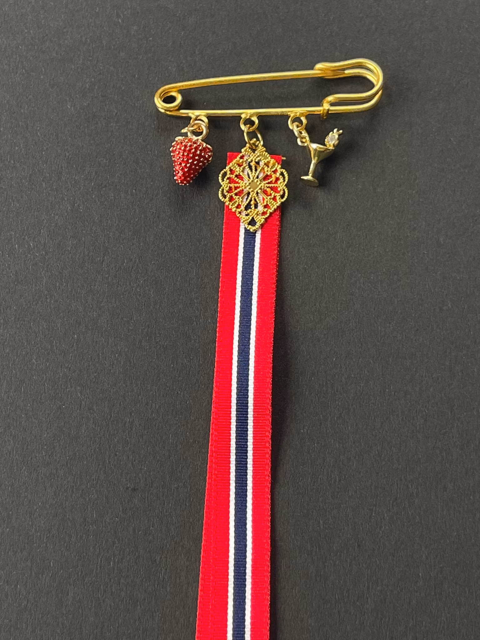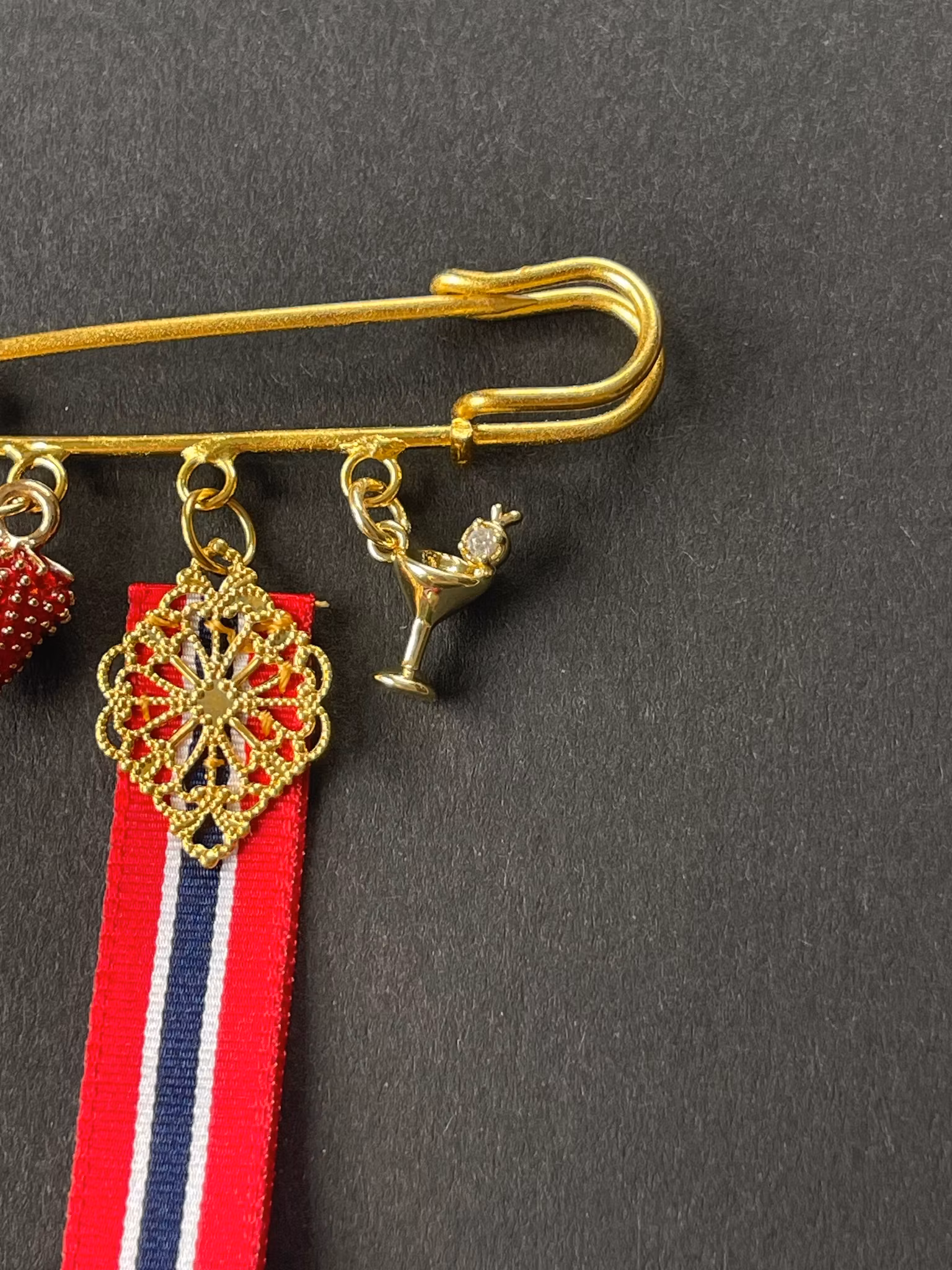 17. mai nål gullforgylt – brosje til bunad med filigran, jordbær og cocktailglass