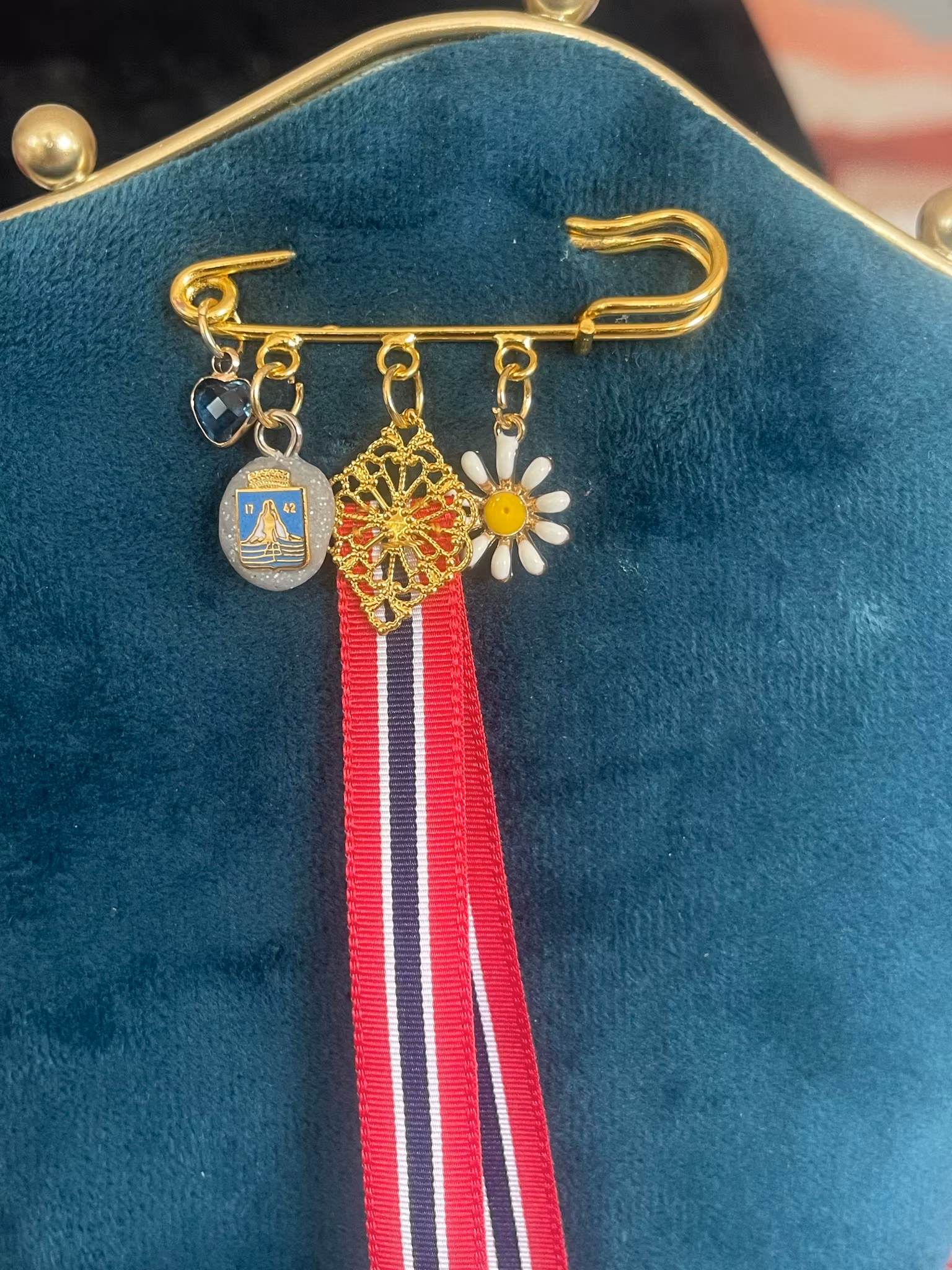 17 mai nål, bunadsnål, brosje bunad, Kristiansund smykke, lokal gave, håndlaget nål, gave til konfirmant, norsk design smykker