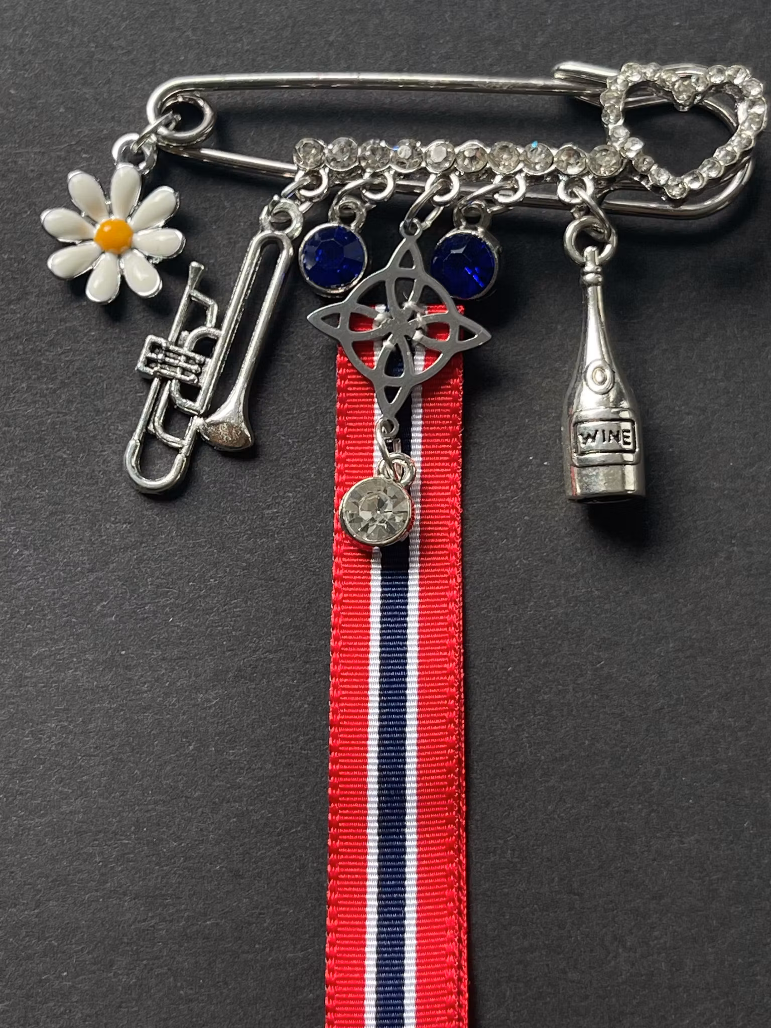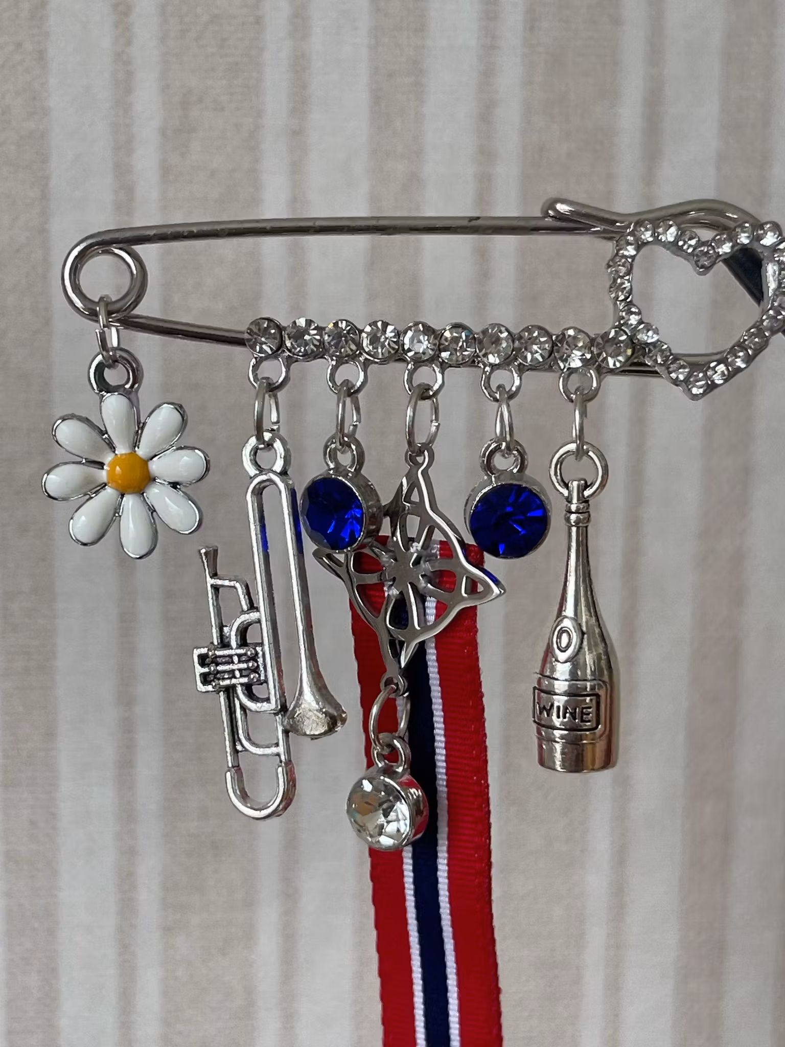 Dekorert med trombone, blomst og en liten vinflaske – en leken detalj som gir skikkelig feststemning.
