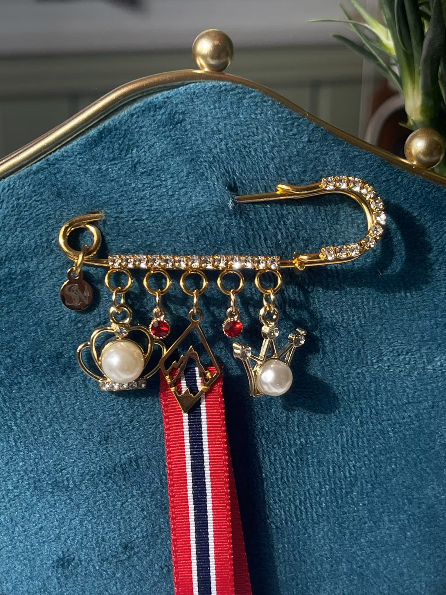 Nåla er rikt dekorert med krystaller og perledetaljer, og flankeres av royale elementer som gir et eksklusivt preg. Den gullforgylte finishen og strass gir et vakkert spill i lyset, og gjør nåla til et blikkfang på bunad eller festantrekk.