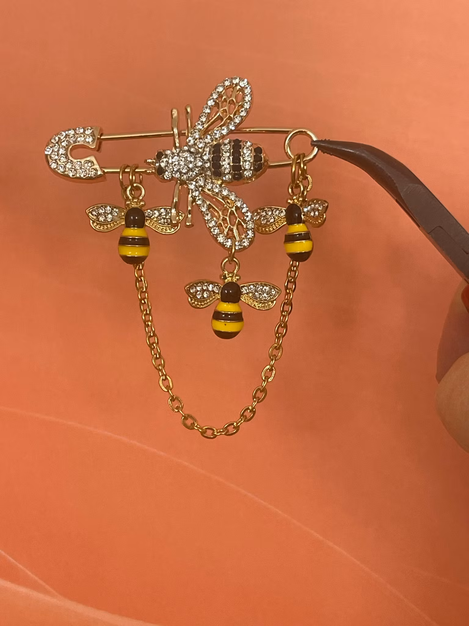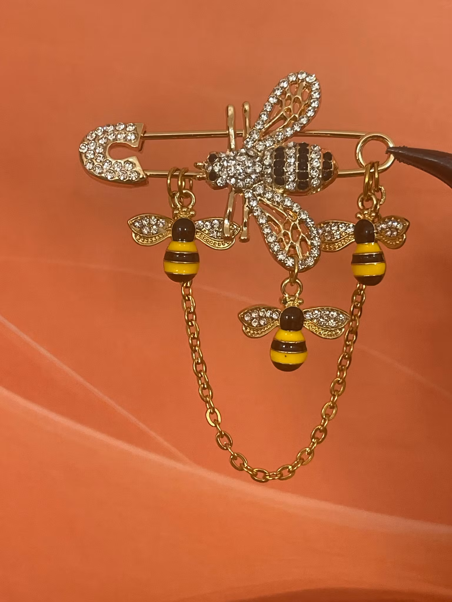 Denne couture-nåla er et blikkfang i seg selv. En rikt dekorert bie med strass og detaljer danner midtpunktet, flankert av mindre bier og delikate lenker som gir bevegelse og liv.