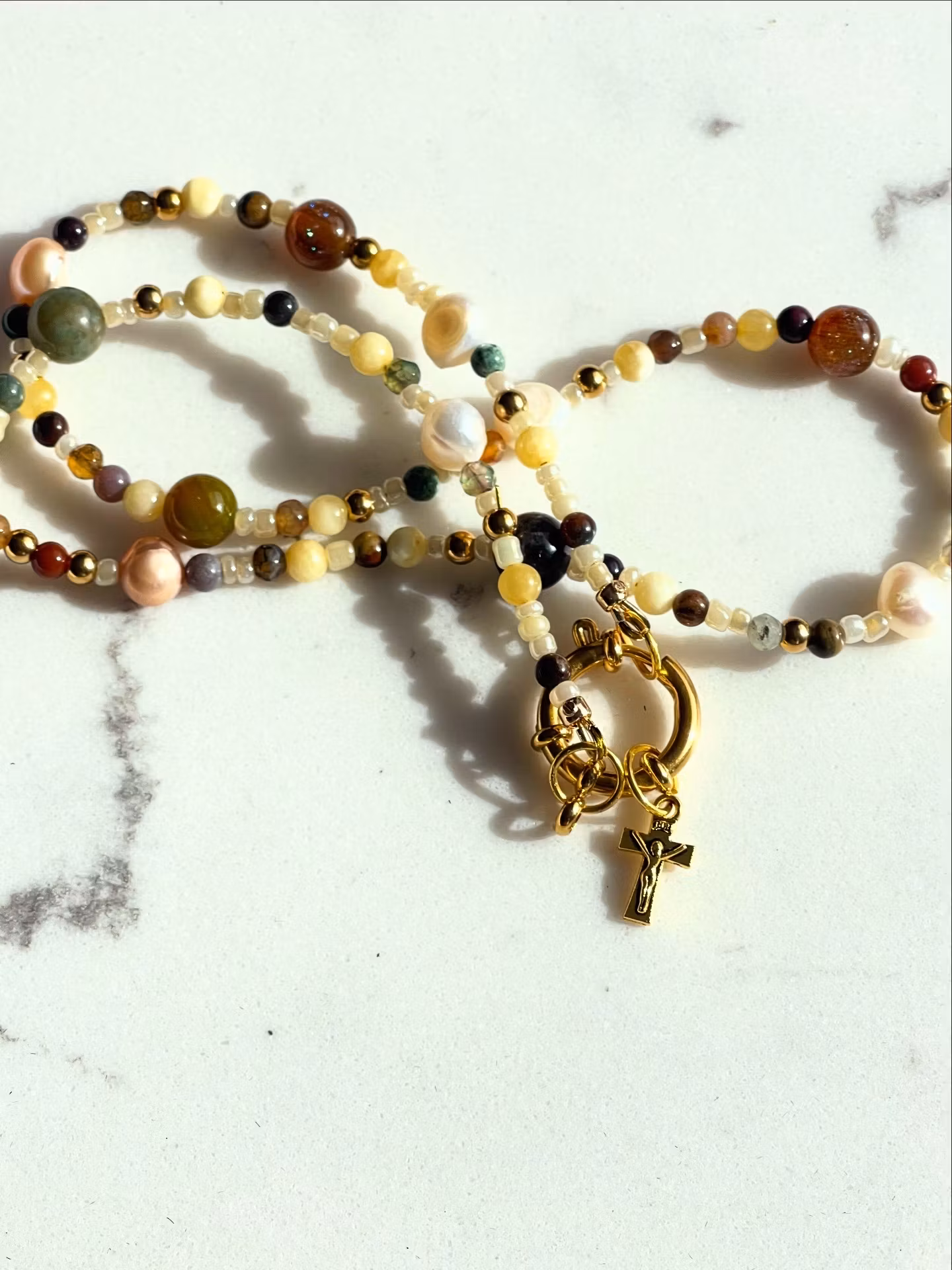 Perler i duse nyanser, ekte ferskvannsperler, halvedelsteiner og kvarts – satt sammen med små detaljer i glass og gull som fanger lyset akkurat der de skal.