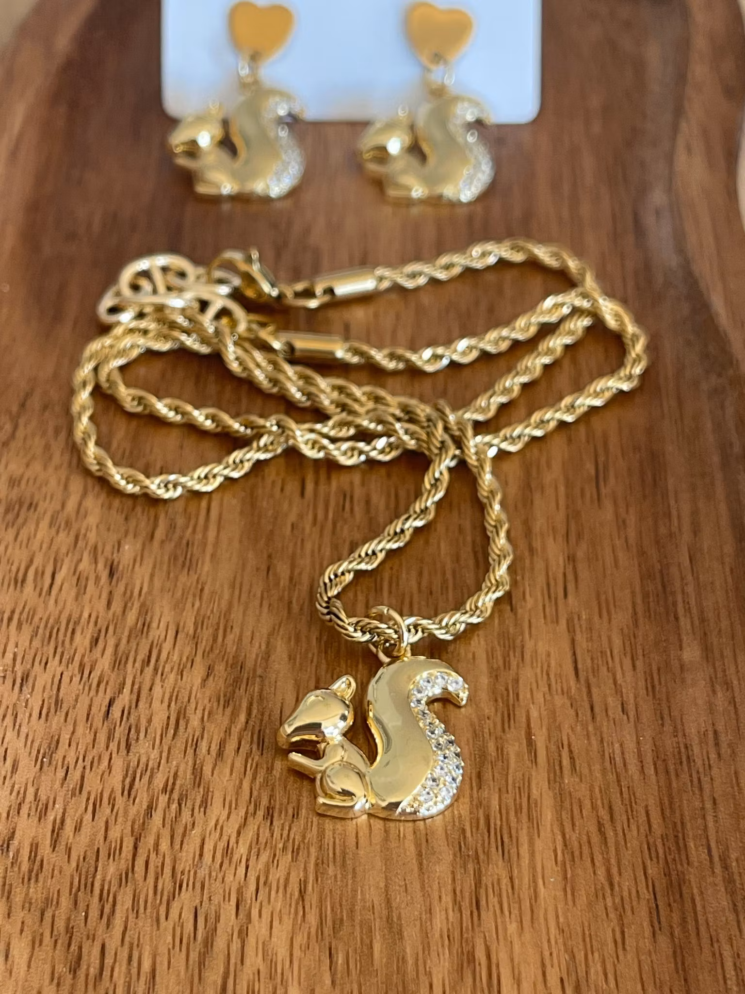 Sjarmerende smykkesett med små ekornanheng på både kjede og øredobber. Den glitrende halen gir smykket et lite snev av luksus – samtidig som motivet er lekent og naturinspirert.