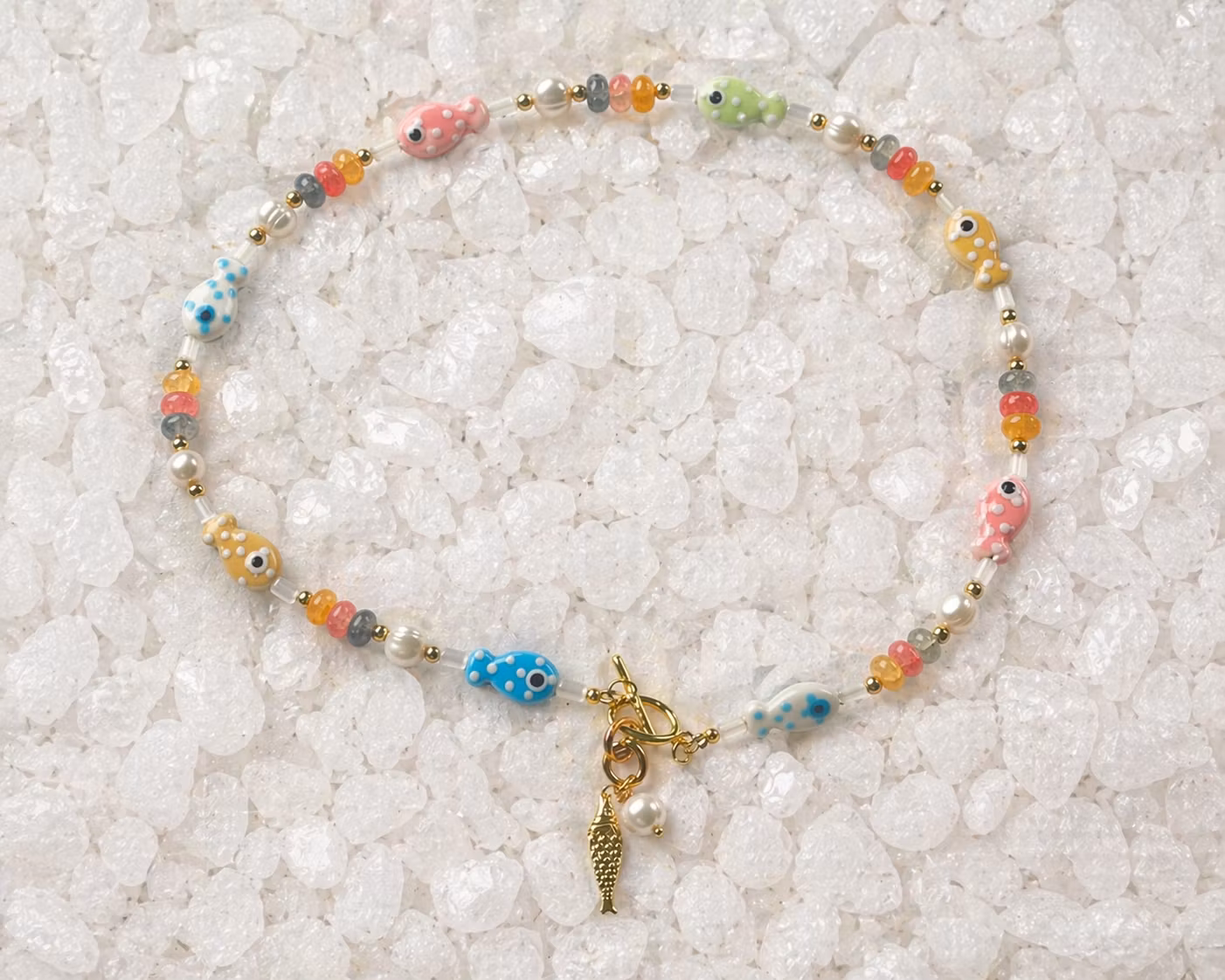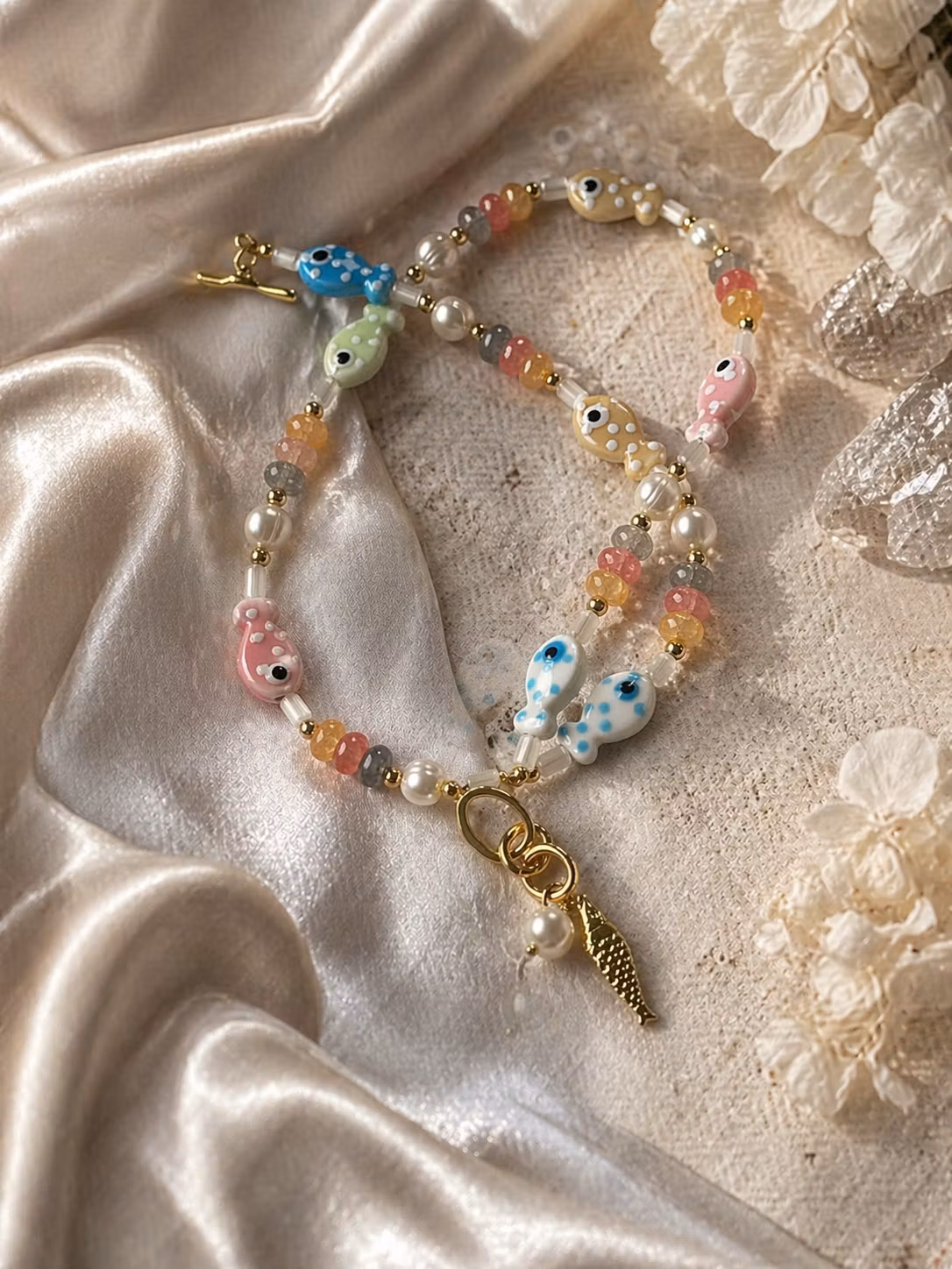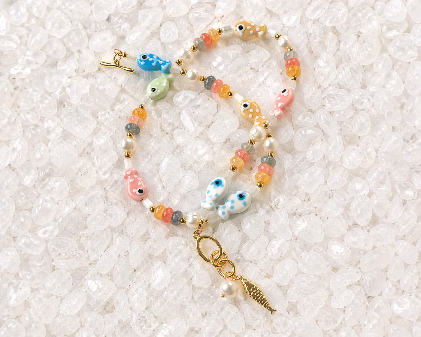 HĂ„ndlaget smykke med ekte ferskvannsperler, kvarts og smĂ„ hĂ„ndmalte fisker đ