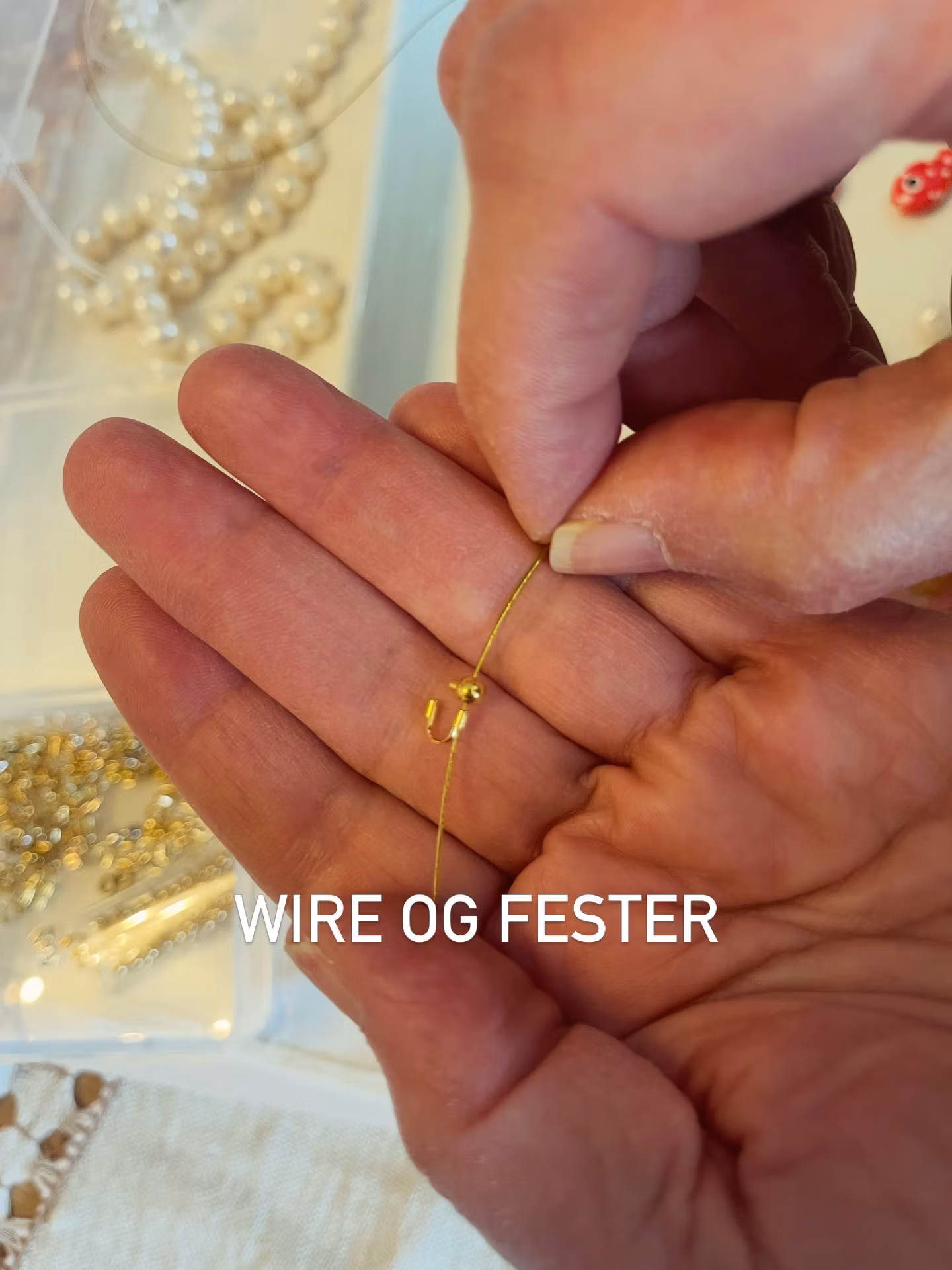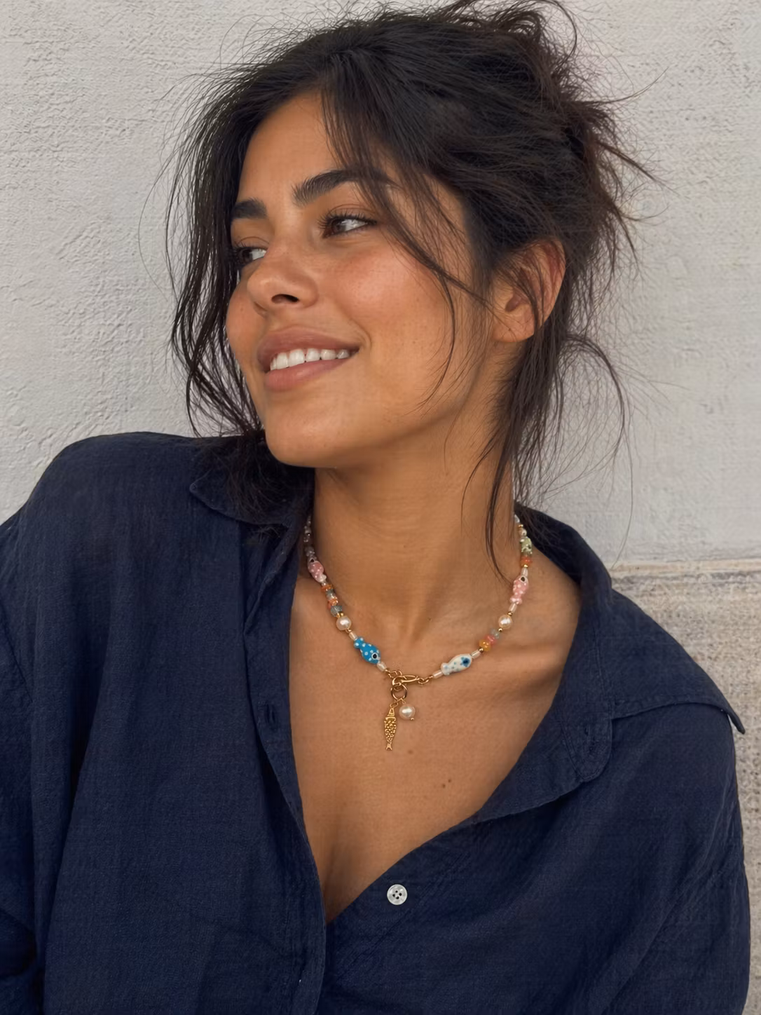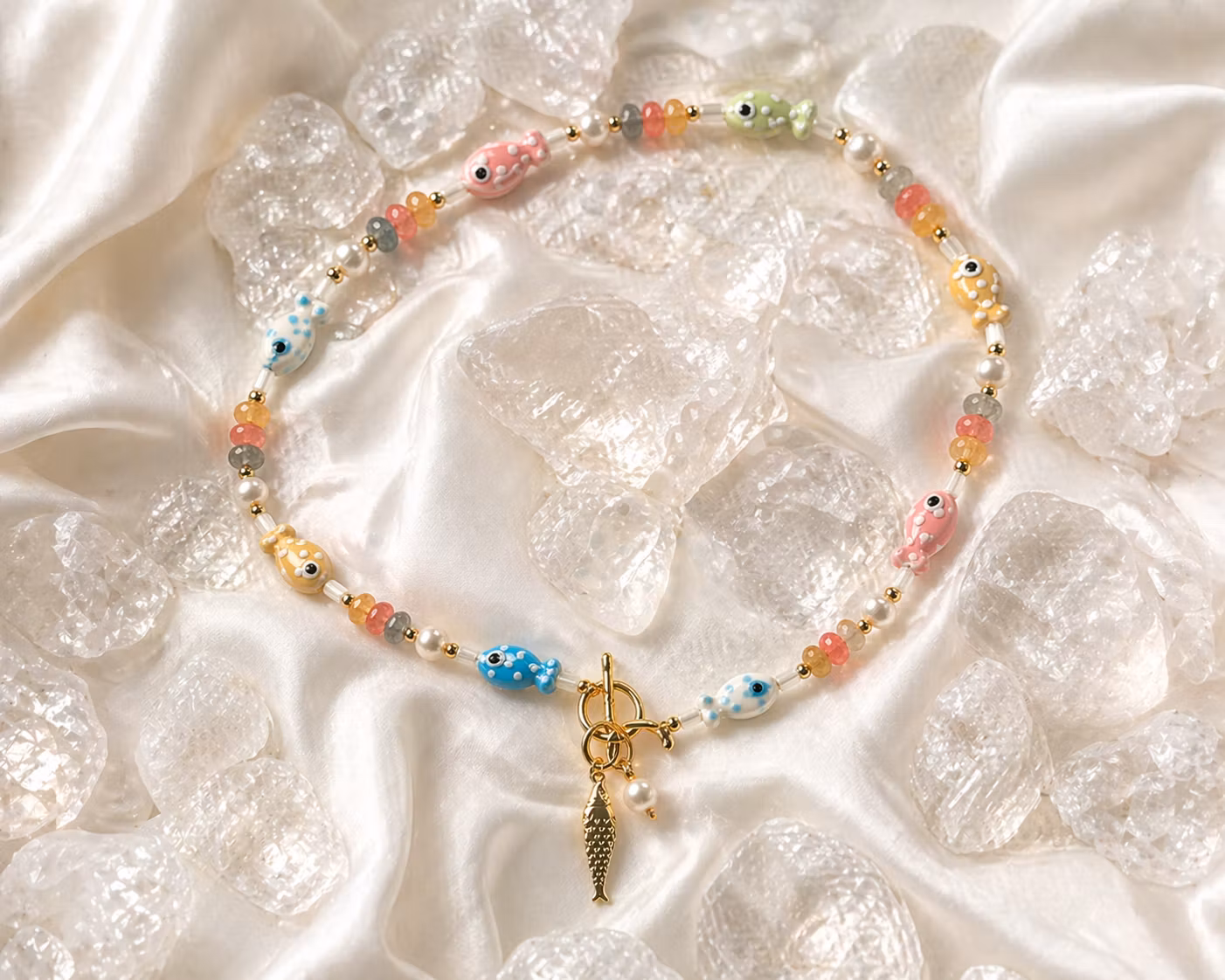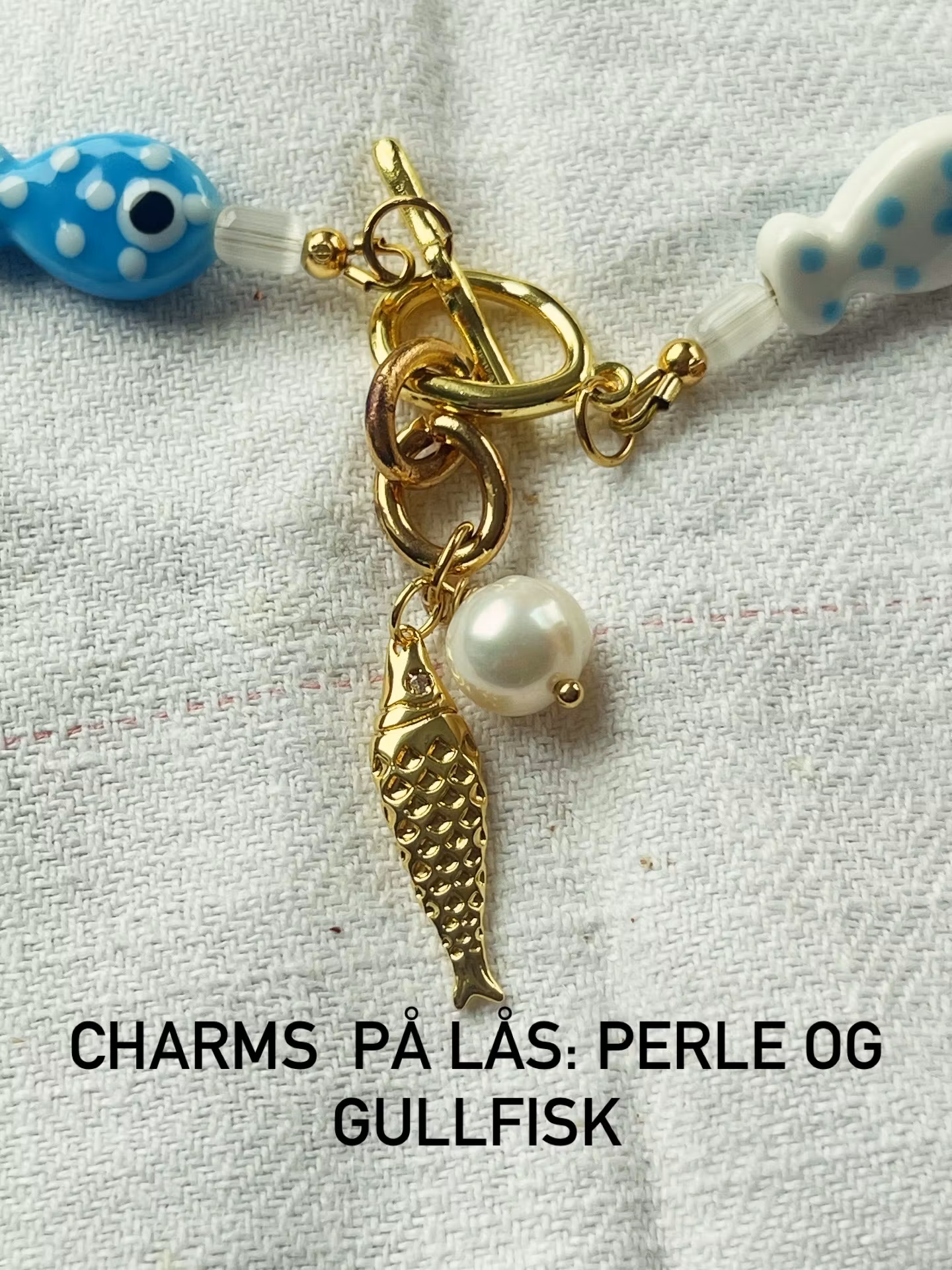 HĂ„ndlaget smykke med ekte ferskvannsperler, kvarts og smĂ„ hĂ„ndmalte fisker đ