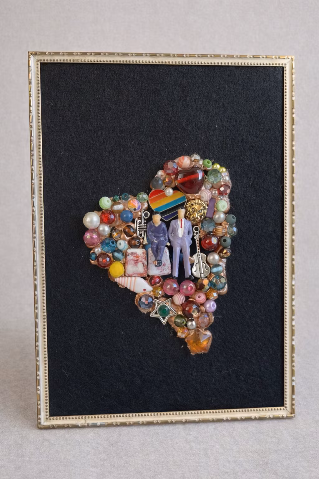 “Gutta i rocken” er et håndlaget hjertebilde bygget opp av charms, miniatyrfigurer, perler og smykkestener i ulike former og materialer. I sentrum står to figurer omgitt av symboler, farger og musikalske detaljer – en liten hyllest til kjærlighet, identitet og rockens energi 🎸✨
