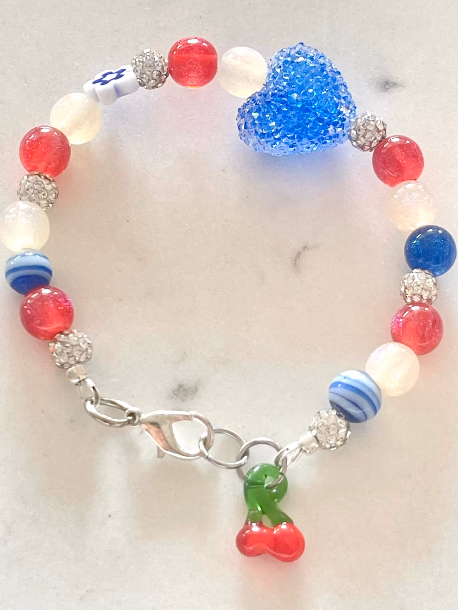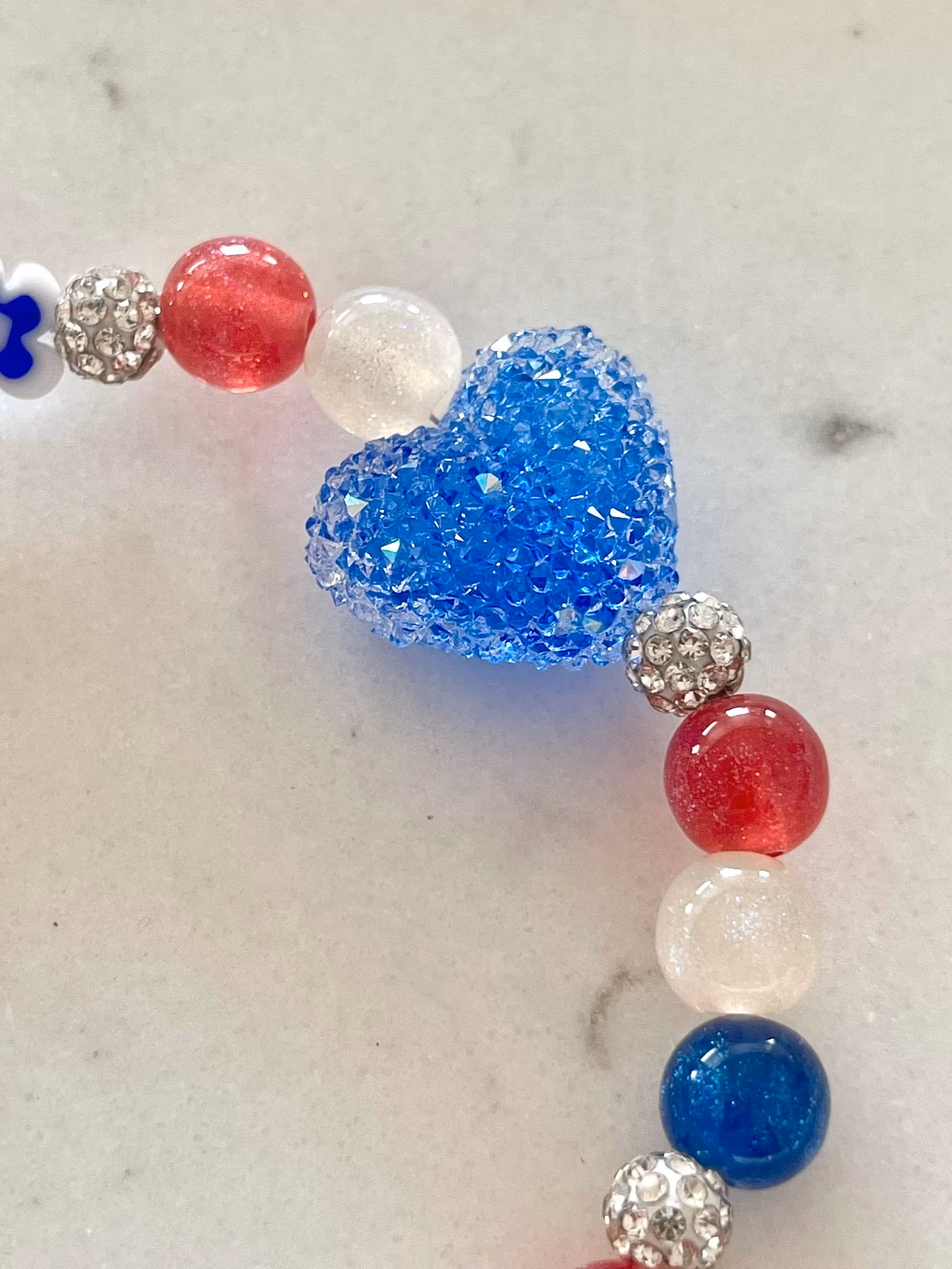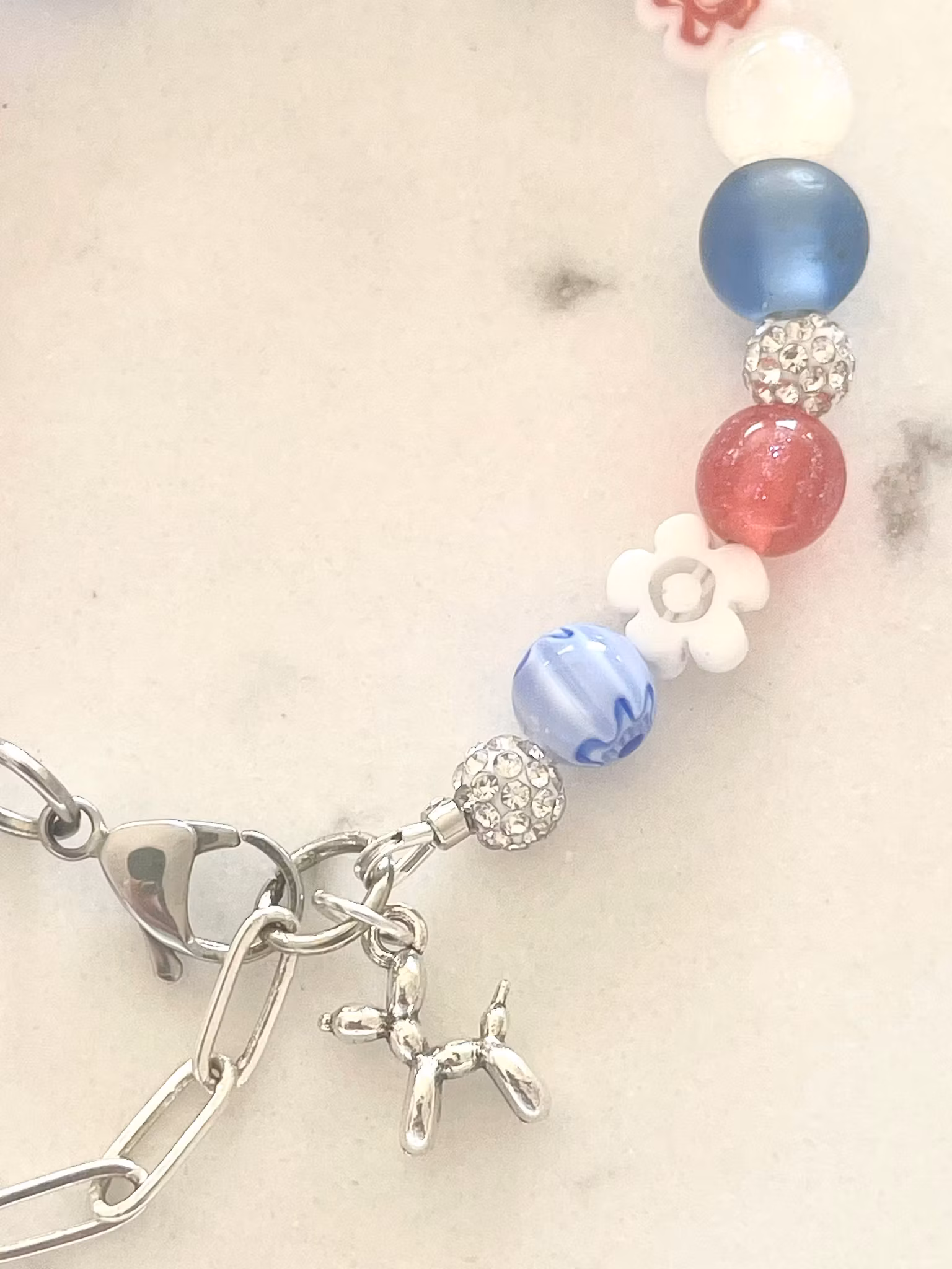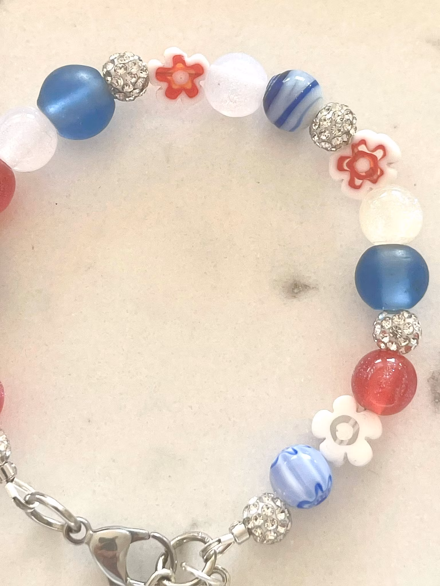 Armbånd i rødt, hvitt og blått laget med perler og jubel. Låsene har elastik eller ekstra lenke for justering og passer dermed de fleste. Se varianter. 🇳🇴