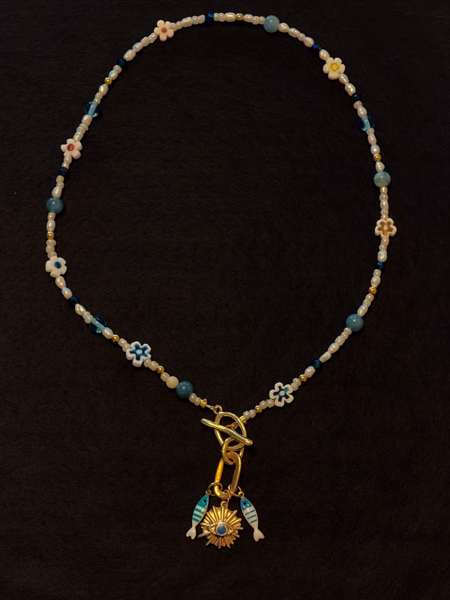 Et lekent smykke med små fisker, blomster og perler i myke blåtoner – inspirert av havet og lange sommerdager.