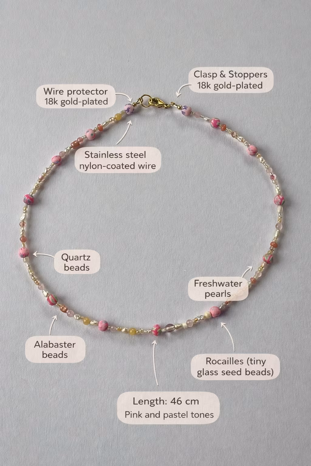 Halskjede (46 cm) og matchende armbånd satt sammen av kvarts, alabast, ekte ferskvannsperler, rocailles og håndlagde millefioriperler i lyse, varme pasteller.