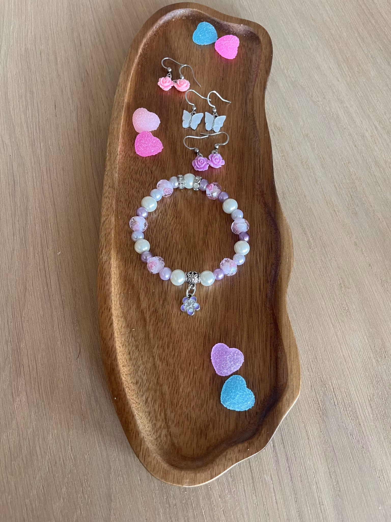 SĂžtt og vĂ„rlig smykkesett i rosa, lilla og perlemorshvite toner â hĂ„ndlaget. Perfekt til smĂ„ festdager, bursdager eller som gave.