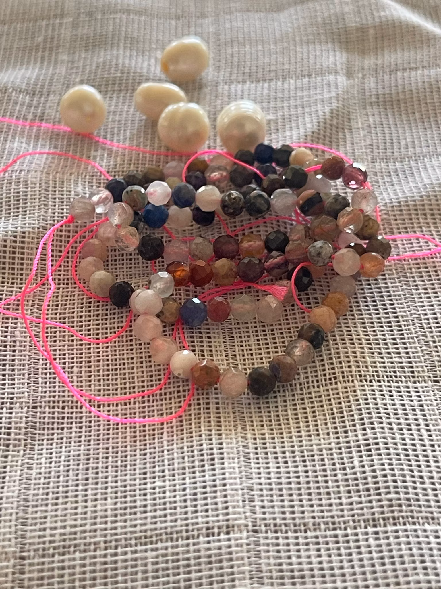 Unikt armbånd med ekte store ferskvannsperler med små fasetterte og mangefargede perler av kvarts. Perlene er tredd på wire belagt med nylon. Lås og lenke i gullforgylt rustfritt stål. Lengde fra 17-19 cm. Small på innerste ring, Medium og Large på forlenger.